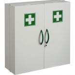 Pour atelier, infirmerie, vestiaire... En acier poudré anti-UV blanc, portes sérigraphiées 'croix verte' et autocollant 'consignes de sécurité à suivre'. Fermeture magnétique et à clé. Livrée vide.