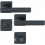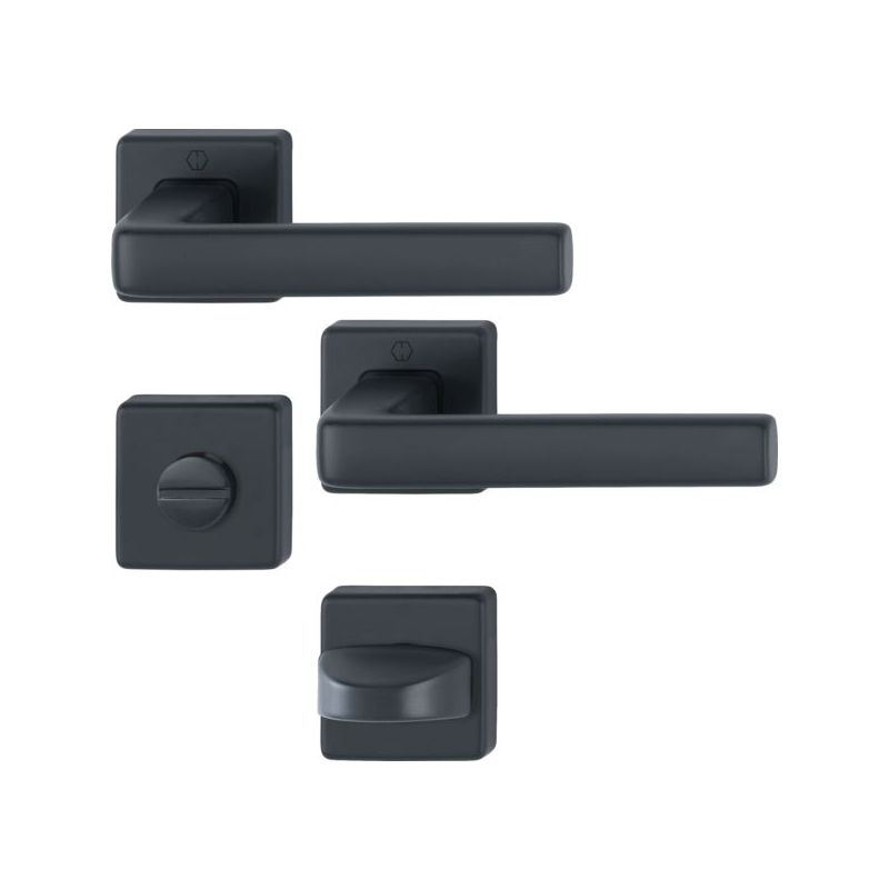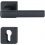 Pour porte intérieure d'épaisseur 37 à 47 mm. Garniture avec ressort de rappel à double sens, bague de guidage sans entretien. Fixations non visibles. Dimension rosaces : Ø 44 mm Épaisseur rosaces : 8 mm Longueur béquille : 120 mm Saillie de la béquille : 40 mm Fouillot carré : 7 mm Finition : noir mat Conditionnement : boîte Colisage : carton de 10 boites de 2 pièces