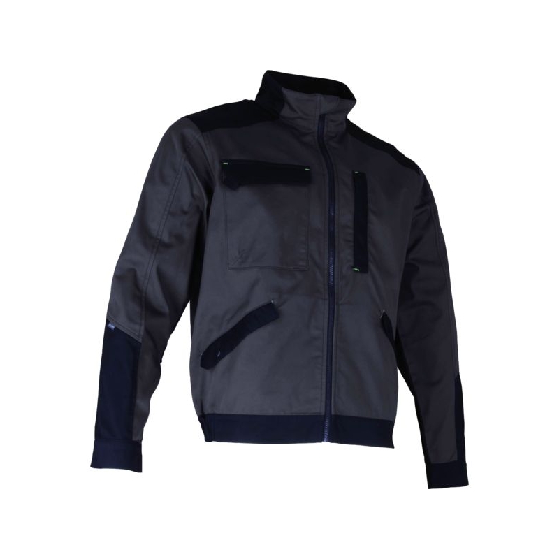 Sergé 60% coton 40% polyester, 280 g/m². Col montant, empiècements contrastants, 1 poche poitrine plaquée et zippée, 1 poche plaquée avec pince et fermée par bande auto-agrippante, 2 poches passepoilées, fermées par rabats et boutons pressions. Poignets fermés par pressions, fermeture à glissière, ceinture élastiquée côtés. Coloris : gris/noir Taille : 1 à 5
