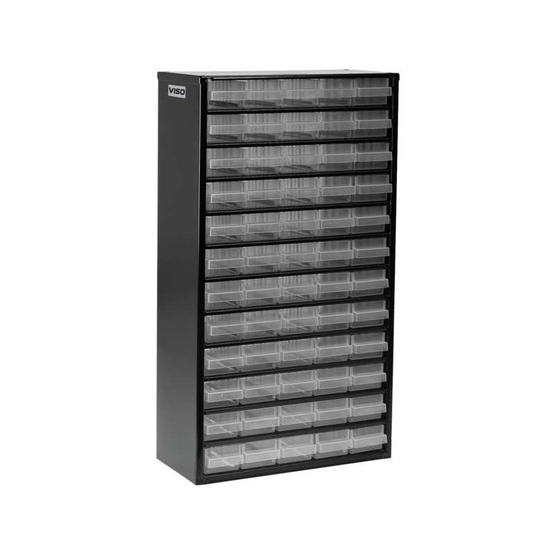 En métal laqué noir, tiroirs incassables en polypropylène transparent avec poignée, porte-étiquettes, étiquettes et séparateurs. À suspendre ou à poser. Livré avec fixations murales.