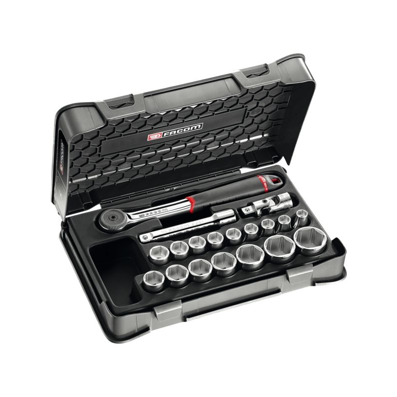 Boîte MBOX, ouverture à 180° à verrouillage automatique, surface adhérente, empilable et personnalisable. Composé de : - 1 cliquet hautes performances étanche S.161B, mécanisme 72 dents, reprise à 5°, inversion par chapeau rotatif, - 16 douilles 6 pans 10 - 11 - 12 - 13 - 14 - 15 - 16 - 17 - 18 - 19 - 21 - 22 - 24 - 27 - 30 - 32 mm, - 1 cardan universel, - 1 rallonge 130 mm.