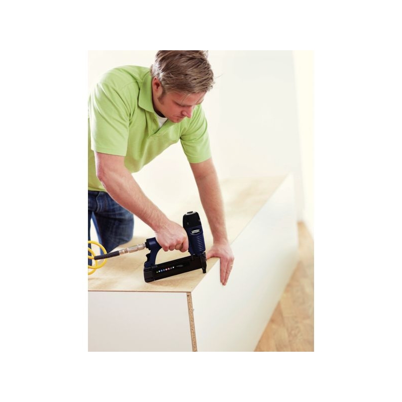 Parfait pour les travaux bois : pose de panneaux, de lambris, ossatures diverses. Pression d'air nécessaire : 5 à 7 bar Capacité magasin : 110 pointes Utilise des pointes n°8 de 15 à 50 mm de 300 pointes. Poids : 1,300 kg Livré en coffret avec une paire de lunettes de protection, une burette d'huile, un jeu de clés Allen et un kit de démarrage.