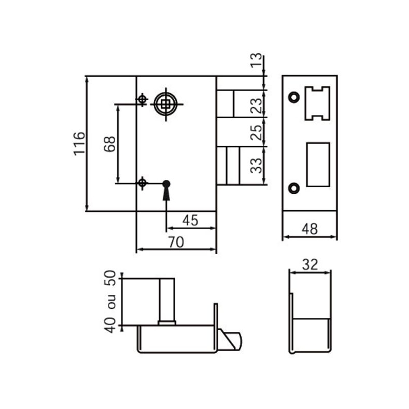 Vertical, à fouillot, pour tout type de porte. Pêne ½ tour en acier zingué. Livré avec gâche et 2 clés. Coffre : 70 x 116 x 25 mm Canon : 40 mm Axe : 44 mm Entraxe : 68 mm Fouillot carré : 7 mm Course du pêne dormant : 16 mm Finition : époxy noir grainé Conditionnement : boite