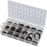 Composé de 225 circlips. Internes : - Ø 11 mm (15 pièces), - Ø 13 mm (10 pièces), - Ø 14 mm (10 pièces), - Ø 16 mm (15 pièces), - Ø 19 mm (10 pièces), - Ø 20 mm (10 pièces). Externes : - Ø 6 mm (15 pièces), - Ø 8 mm (15 pièces), - Ø 9 mm (15 pièces), - Ø 11 mm (15 pièces), - Ø 13 mm (15 pièces), - Ø 14 mm (15 pièces), - Ø 16 mm (15 pièces), - Ø 19 mm (15 pièces), - Ø 20 mm (10 pièces), - Ø 22 mm (10 pièces), - Ø 25 mm (10 pièces), - Ø 32 mm (5 pièces).