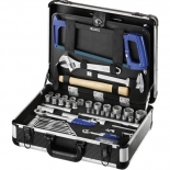 Composé de douilles, cliquet, clés mixtes, embouts et outils de vissage, pinces, clés mâles, outils de mesure, monture de scie, outils de frappe.