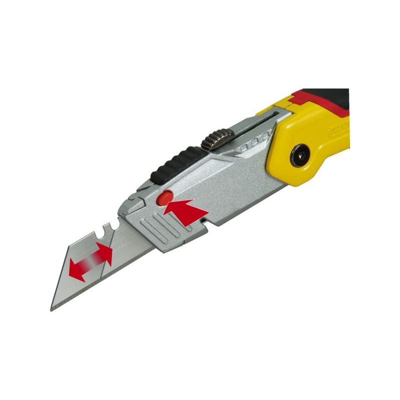 Couteau pliable et compact à ouverture d'une seule main. Changement facile et rapide de la lame. Lame rétractable. Poignée bi-matière. Réservoir de lames intégré. Livré avec 3 lames trapèze.