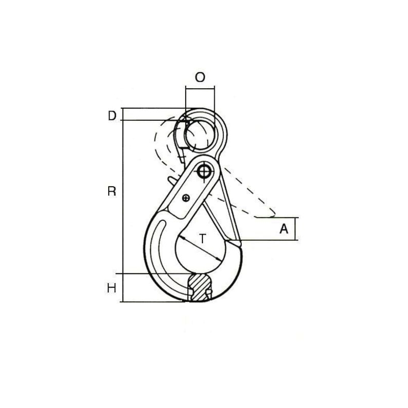 Crochet à verrouillage automatique à œil haute résistance. Acier allié grade 80, peint en rouge. Marquage : Ø de chaîne utile, CE, fabricant, classe d'acier Coefficient de sécurité : 4