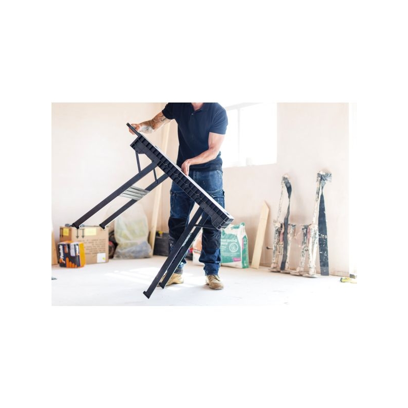 Poignée télescopique pour un transport facile. Dimensions position ouverte : 85 x 60 x 80 cm Dimensions position fermée : 85 x 60 x 10.5 cm Dimensions de la surface de travail : 85 x 60 cm Capacité de charge : 250 kg Poids : 12 kg Temps de montage/démontage : 5 secondes