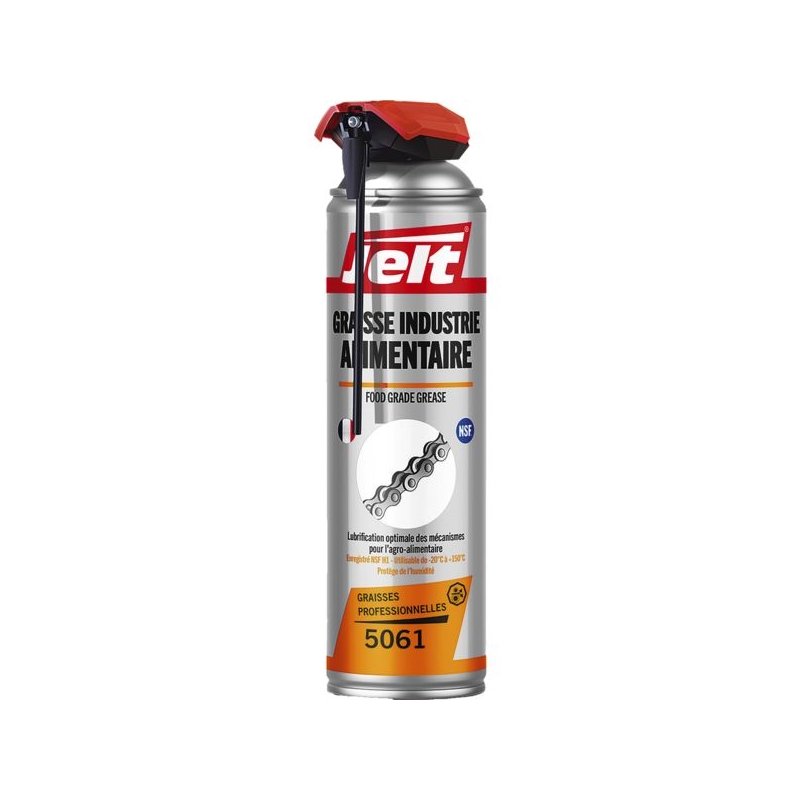 Permet une luibrification légère à moyenne des pièces en mouvement, petits roulements, paliers lisses et engrenages. Destinée au matériel de fabrication de produits comestibles : laiteries, fromageries... Assure une lubrification très longue durée de tous les mécanismes traités. Excellente capacité à supporter les charges. Extrêmement propre, ne tache pas. Spray double position. Plage de températures de service : -10°C à +150°C Aérosol : 500 ml net