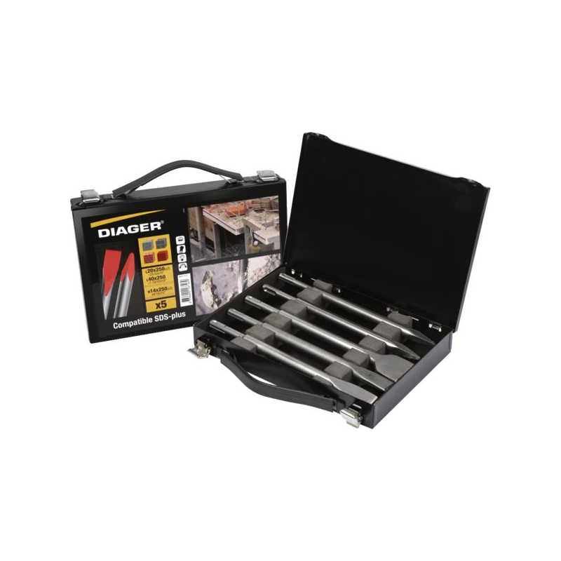 Composée de : - 2 pics Ø 14 x 250 mm, - 2 burins Ø 20 x 250 mm, - 1 burin Ø 40 x 250 mm.