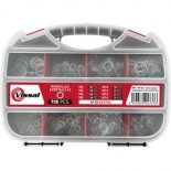 Composée de 700 rondelles éventail acier zingué : - Ø 4 mm (100 pièces), - Ø 5 mm (100 pièces), - Ø 6 mm (200 pièces), - Ø 8 mm (120 pièces), - Ø 10 mm (100 pièces), - Ø 12 mm (45 pièces), - Ø 14 mm (25 pièces), - Ø 16 mm (10 pièces). Norme : NF EN ISO 27624