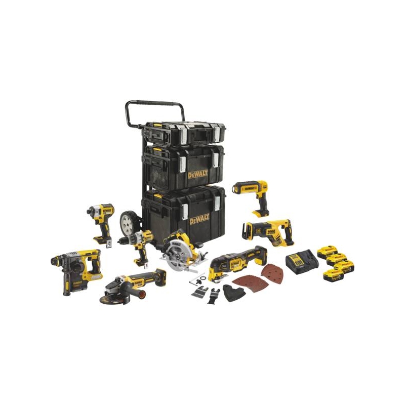 Fonctionne sur batterie 18 V. Perceuse à percussion DCD996 : Éclairage LED. 3 vitesses, 11 réglages de couple. Moteur sans charbon. Cadence de frappe : 8600-25500-38250 cps/mn Couple : 95 Nm Vitesse : 500-1500-2250 tr/mn Poids : 1,600 kg Visseuse à chocs DCF 887 : Moteur sans charbon. Vitesse : 1000-2800-3250 tr/mn Cadence de frappe : 3800 cps/mn Couple : 205 Nm Porte-outils : 1/4 Poids : 0,900 kg Scie circulaire DCS 570 : Moteur sans charbon. Graduation pour régler avec précision la profondeur de coupe jusqu‘à 67 m. Pour les applications les plus courantes de délignage et tronçonnage, pour des coupes droites ou inclinées. Vitesse : 5500 tr/mn Diamètre de la lame : 184 mm Inclinaison de la lame : 57° Profondeur de coupe maximale à 90° : 65 mm Poids : 3,600 kg Multi-cutter DCS 355 : Moteur sans charbon. Vitesse : 20000 ocs/mn Amplitude d'oscillation : 1,6° Poids : 1,100 kg Meuleuse DCG 405 : Moteur XR 18 V sans charbon. Frein électronique et embrayage électronique, réduit les rebonds en cas de blocage du disque. Vitesse : 9000 tr/mn Diamètre disque : 125 mm Poids : 1,740 kg Perforateur SDS-plus DCH 273 : Moteur sans charbon. Puissance de frappe : 2,1 J Vitesse : 1100 tr/mn Cadence de frappe : 4600 cps/mn Poids : 2,500 kg Scie sabre DCS 367 : Moteur sans charbon. Vitesse : 2900 crs/mn Poids : 2,270 kg Lampe LED DCL 050 : Ampoule LED, flux lumineux 250-500 lm Poids : 0,680 kg Livré avec 3 coffrets TSTAK, 1 chargeur, 4 batteries 18 V - 5,0 Ah Li-ion et 1 chariot de transport.