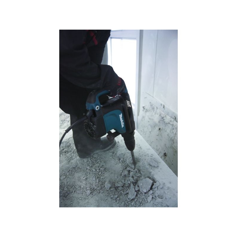 16 positions de burin. Système antivibration AVT. Puissance : 1350 W Puissance de frappe : 9,4 J Vitesse : 130-280 tr/mn Cadence de frappe : 1250-2750 cps/mn Capacité de perçage béton : 45 mm Capacité trépan : couronne 125 mm Taux de vibrations : 7,5 m/s² Emmanchement SDS-Max. Poids : 9 kg Livré en coffret avec poignée, jauge de profondeur, chiffon, tube de graisse.