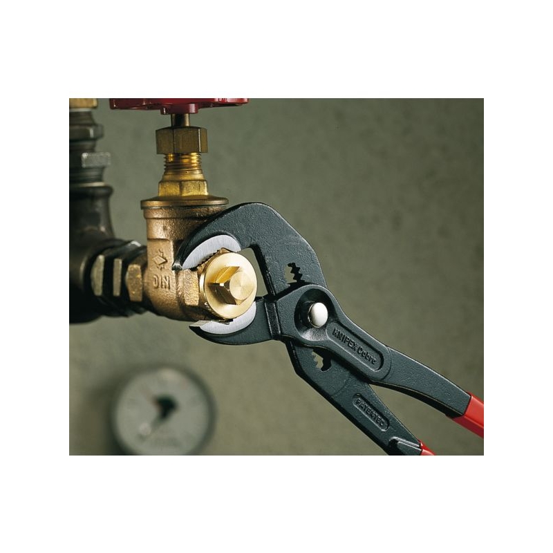 Pince multiprise et clé universelle en un seul outil. Charnière entrepassée, autobloquante sur tubes et boulons. Réglage immédiat et précis par simple pression de l'ergot. Mâchoires à dents spécialement trempées.