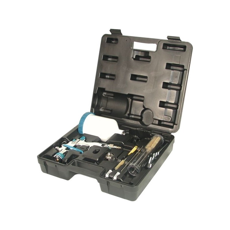 Kit complet avec pistolet basse pression en coffret. Poignée en aluminium. Ensemble buses 1,5 et 1,8 mm. Godet plastique gradué de 0,6 l. Réglages débit air, débit peinture et largeur du jet. Régulateur de pression. Consommation air : 175 l/mn Poids : 0,640 kg Raccord entrée d'air : 1/4’’ Pression d’utilisation : 2 - 2,5 bar Largeur jet maxi. : 220 mm Consommation moyenne produit : 90 cm³/mn