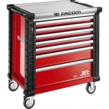 Fermeture centralisée par serrure à clé. Plan de travail plaque d'aluminium avec embouts polypropylène antichoc. 2 poignées latérales avec revêtement bi-matière soft. 4 roues de 125 mm dont 2 pivotantes et une avec frein. Roues résistantes aux hydrocarbures. 24 modules répartis dans les 7 tiroirs de 60 et 130 mm : - 5 tiroirs hauteur 60 mm (20 modules) - 1 tiroir hauteur 130 mm (4 modules) - 1 tiroir hauteur 270 mm Charge maxi. par tiroirs : 195 kg Charge maxi. statique sur plan de travail : 1000 kg Dimensions utiles du plan de travail : 797 x 461 mm Dimensions : L. 964 x P. 546 x H. 971 mm Livrées avec 6 cloisons pour tiroirs de 60 mm et 3 cloisons pour tiroir de 130 mm. Existe en coloris noir réf. JET.7NM4A