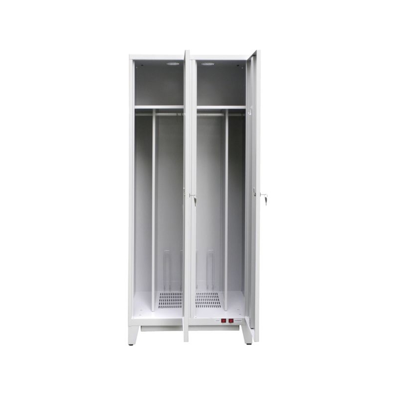 Pour sécher les vêtements de travail. Temps de séchage de vêtements humides estimé en 4-5h. En tôle acier, peinture époxy avec traitement anti-corrosion. Pieds avec vérins de réglage. Tablette soudée, penderie avec cloison de séparation pour vêtements de ville et vêtements de travail. Porte renforcée, fermeture par verrou cadenassable. Aérations. Vestiaires connectables en série. Débit d’air : 150 m³/h Temporisation : 5 h L x H x P : 800 x 1940 x 490 mm Options, version 1000 W et sur socle banc, sur consultation.