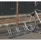 Râtelier robuste en acier zingué, base en tube carré de 30 mm, arceaux doubles en tube Ø 16 mm. Passage de roue universel : pneus de 35 à 55...